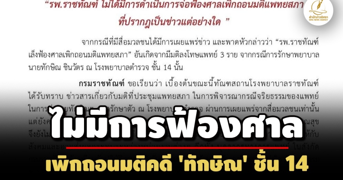สำนักข่าวอิศรา (www.isranews.org) รายงานว่า เมื่อวันที่ 11 พฤษภาคม 2568 กรมราชทัณฑ์ได้ออกเอกสารชี้แจงกรณีมีสื่อมวลชนเผยแพร่ข่าว และพาดหัวกล่าวว่า “รพ.ราชทัณฑ์ เล็งฟ้องศาลเพิกถอนมติแพทยสภา” อันเกิดจากมีมติลงโทษแพทย์ 3 ราย จากกรณีการรักษาพยาบาลนายทักษิณ ชินวัตร ณ โรงพยาบาลตำรวจ ชั้น 14 นั้น