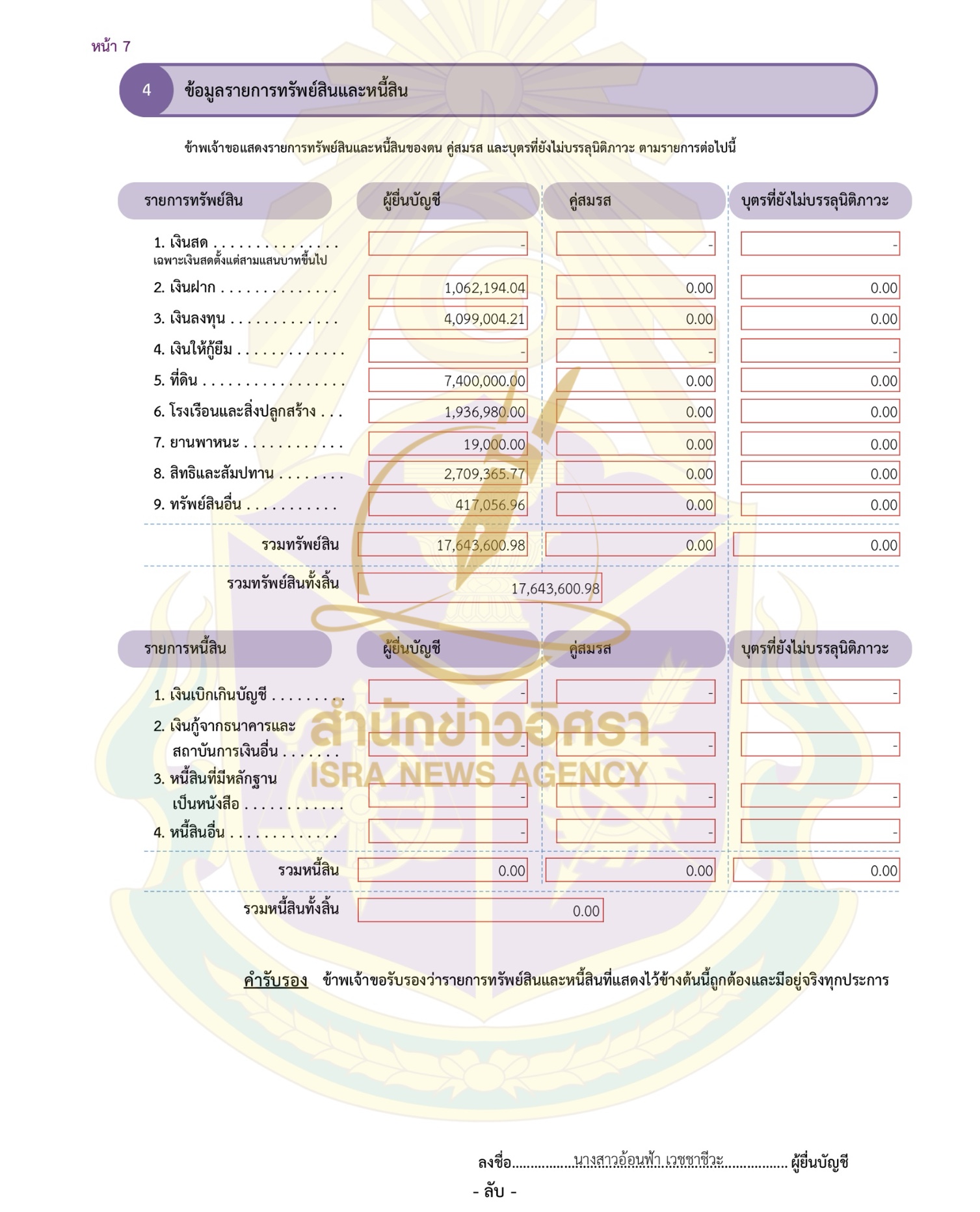 ทั้งนี้นางสาวอ้อนฟ้า แจ้งมีรายได้ต่อปีโดยประมาณ 2,143,132 บาท ประกอบด้วย เงินเดือน 1,453,132 บาท เบี้ยประชุม 690,000 บาท แจ้งมีรายจ่ายต่อปีโดยประมาณ 1,810,711 บาท