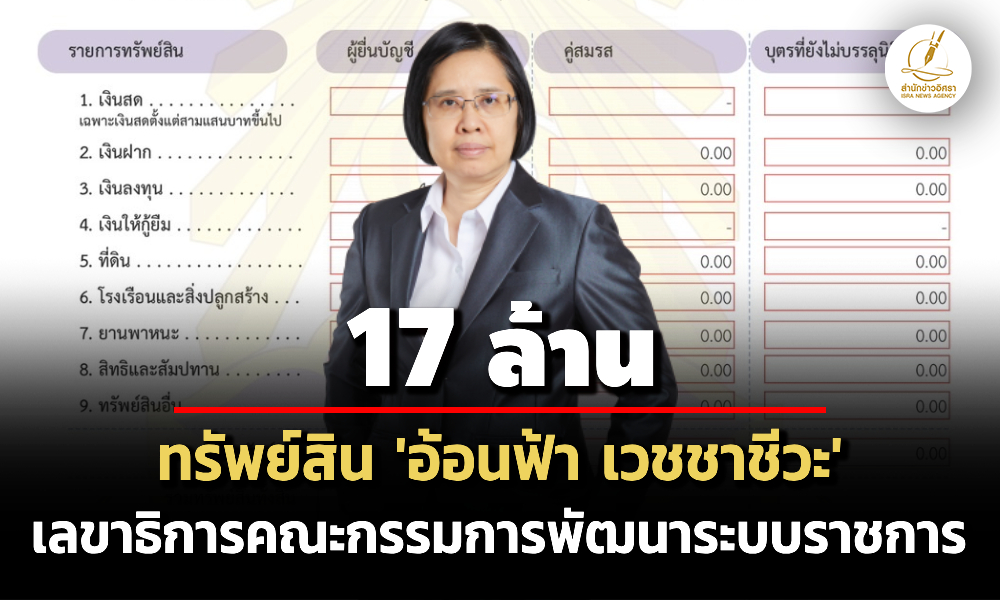 ป.ป.ช. เปิดทรัพย์สินผู้ดำรงตำแหน่งรดับสูง 'อ้อนฟ้า เวชชาชีวะ' เลขาธิการคณะกรรมการพัฒนาระบบราชการ ทรัพย์สิน 17 ล. รายได้ 2.1 ล./ปี
