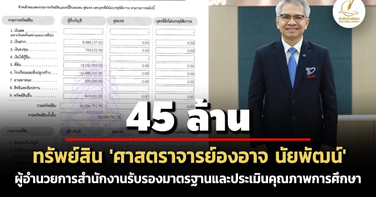 ป.ป.ช. เปิดทรัพย์สินผู้ดำรงตำแหน่งระดับสูง 'ศาสตราจารย์องอาจ นัยพัฒน์' ผู้อำนวยการสำนักงานรับรองมาตรฐานและประเมินคุณภาพการศึกษา ทรัพย์สิน 45 ล. เงินฝาก 8 ล. ที่ดิน 19 ล. รายได้ 2 ล./ปี