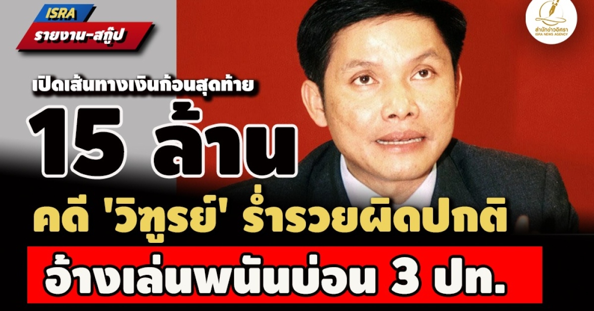 ทั้งหมดนี้ เป็นข้อมูลรายละเอียดเกี่ยวกับเงินรายการที่ 1 จำนวน 15,000,000 บาท ในคดีร่ำรวยผิดปกติ ของ นายวิฑูรย์ ที่สำนักข่าวอิศรา ตรงจสอบพบล่าสุด
