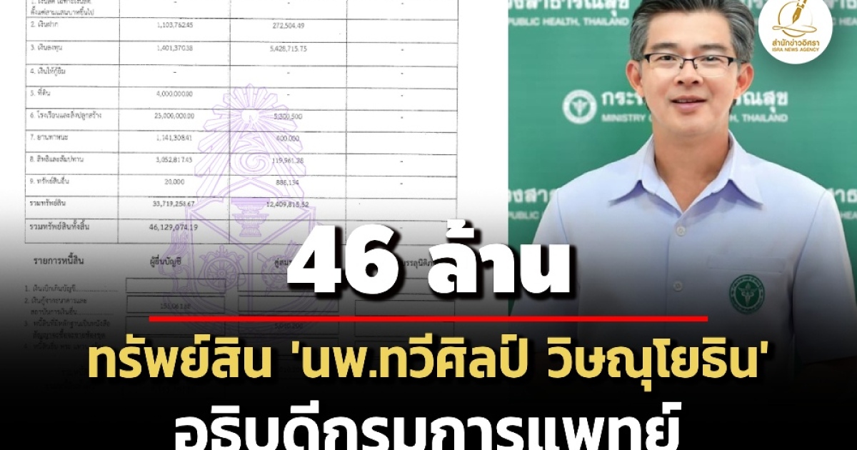 ป.ป.ช. เปิดทรัพย์สินผู้ดำรงตำแหน่งระดับสูง 'นพ.ทวีศิลป์ วิษณุโยธิน' อธิบดีกรมการแพทย์ ทรัพย์สิน 46 ล. มีบ้าน+ห้องชุด 23 ล. รายได้ 3.3 ล./ปี