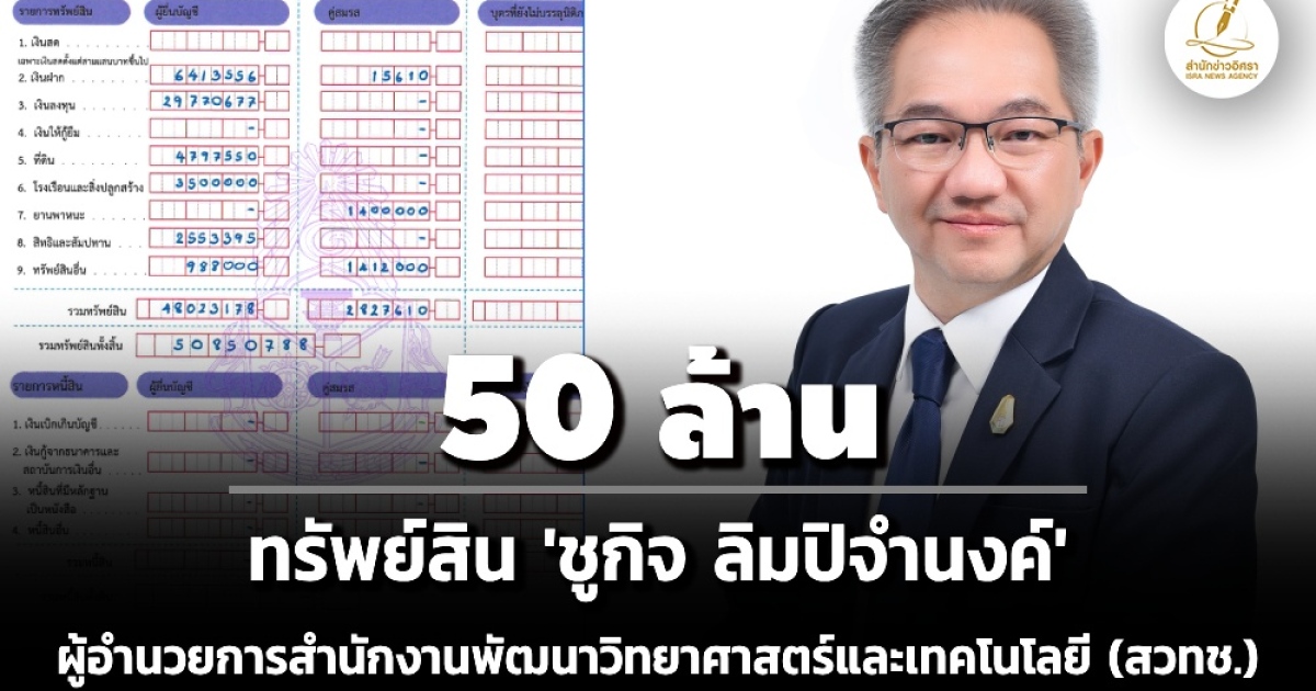 ป.ป.ช. เปิดทรัพย์สินผู้ดำรงตำแหน่งระดับสูง 'ชูกิจ ลิมปิจำนงค์' ผู้อำนวยการสำนักงานพัฒนาวิทยาศาสตร์และเทคโนโลยี ทรัพย์สิน 50 ล. เงินลงทุน 29 ล. รายได้ 4.9 ล./ปี ไร้หนี้สิน
