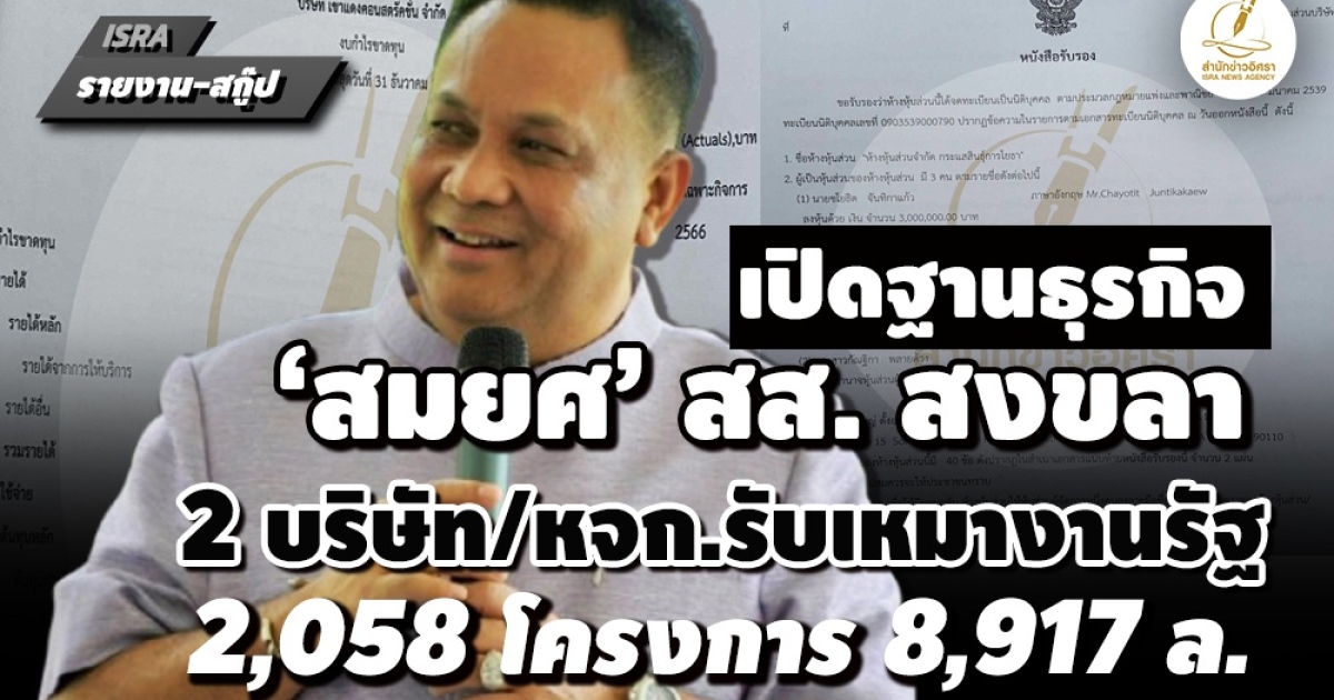 เปิดฐานธุรกิจ ‘สมยศ พลายด้วง’สส. สงขลา 2 บริษัท/ห้างรับเหมา ‘เขาแดงฯ- กระแสสินธุ์การโยธา’ แจ้งงบฯปีล่าสุด 2 แห่งรายได้ 988.4 ล. พบคู่สัญญาหน่วยงานรัฐปี 2558-2568 รวม 2,058 โครงการ 8,917.7 ล้าน