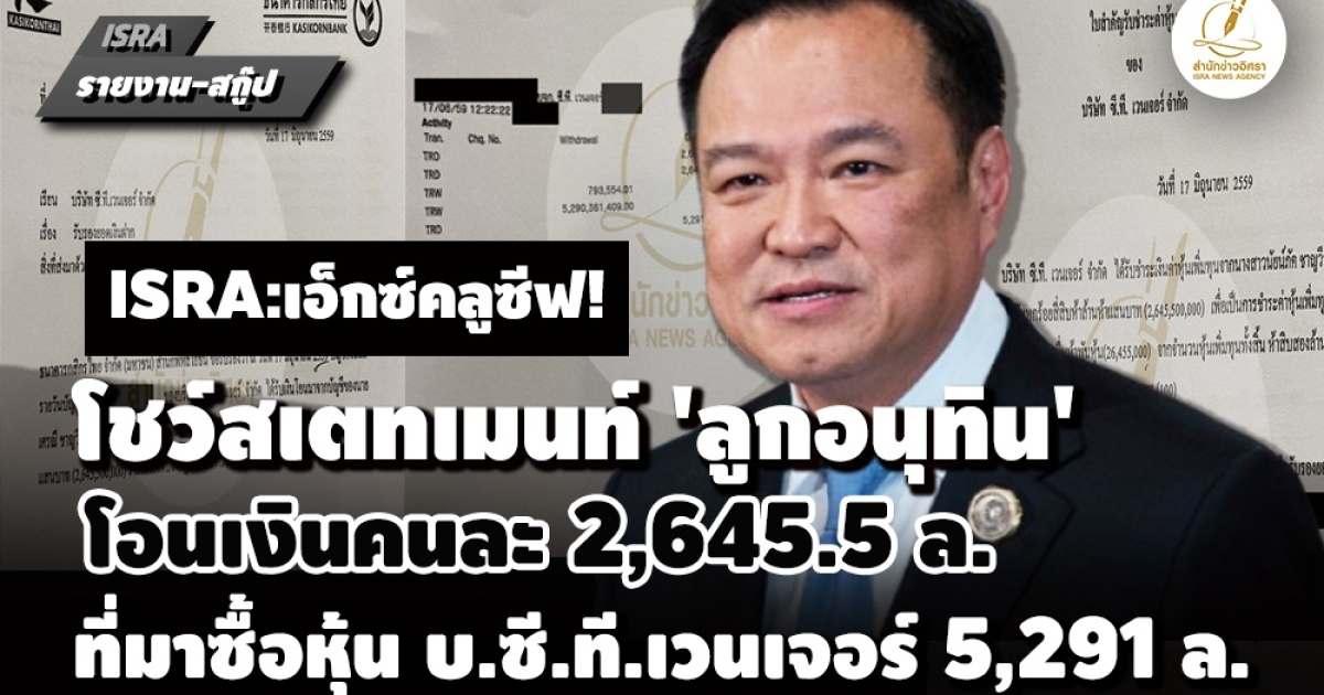 - 2 กก.สาวลูกหนี้ 135.9 ล.‘อนุทิน’! ถือหุ้น 30 ล. บ.ครอบครัวนายกฯ-อีกราย‘คนทำบัญชี
