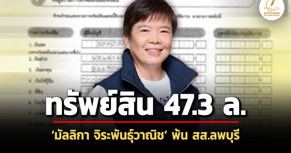 ทรัพย์สิน 47.3 ล้าน ‘มัลลิกา จิระพันธุ์วาณิช’ พ้น สส.ลพบุรี ที่ดิน 14 แปลง สิ่งปลูกสร้าง 7 รายการ คลังสินค้า-บ้าน สะสมปืน 6 กระบอก เทียบก่อนหน้าช่วงเข้ารับตำแหน่งปี 66 ยอดลดลง 7.5 แสน