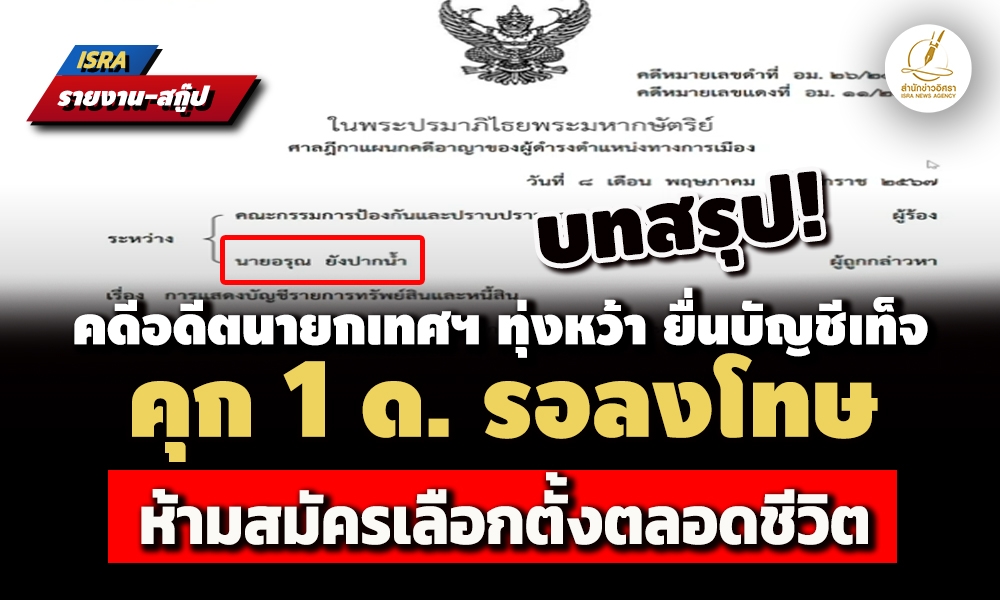 คำพิพากษาศาลฎีกาแผนกคดีอาญาของผู้ดำรงตำแหน่งทางการเมือง คดีหมายเลขดำที่ อม. 26/2566 คดีหมายเลขแดงที่ อม 11/2567 วันที่ 8 พฤษภาคม 2567 พิพากษาว่านายอรุณ ยังปากน้ำ ผู้ถูกกล่าวหาจงใจยื่นบัญชีแสดงรายการทรัพย์สินและหนี้สินและเอกสารประกอบด้วยข้อความอันเป็นเท็จหรือปกปิดข้อเท็จจริงที่ควรแจ้งให้ทราบ และมีพฤติการณ์อันควรเชื่อได้ว่ามีเจตนาไม่แสดงที่มาแห่งทรัพย์สินหรือหนี้สิน กรณีพ้นจากตำแหน่งนายกเทศมนตรีตำบลทุ่งหว้า อำเภอทุ่งหว้า จังหวัดสตูล ให้เพิกถอนสิทธิสมัครรับเลือกตั้งตลอดไป และจำคุก 2 เดือน ปรับ 8,000 บาท ผู้ถูกกล่าวหาให้การรับสารภาพเป็นประโยชน์แก่การพิจารณา เป็นประโยชน์แก่การพิจารณา มีเหตุบรรเทาโทษ ลดโทษตามประมวลกฎหมายอาญา คงจำคุก 1 เดือน ปรับ 4,000 บาท ไม่ปรากฏว่าผู้ถูกกล่าวหาเคยได้รับโทษจำคุกมาก่อน โทษจำคุกในรอการลงโทษไว้มีกำหนด 1 ปี