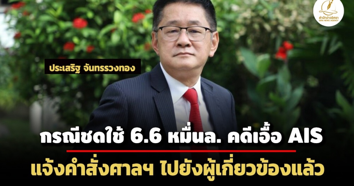'ประเสริฐ จันทรรวงทอง' รมว.ดีอี แจงกรณี ‘ศาลฎีกา’ สั่ง ‘สุธรรม มลิลา' ผู้เกี่ยวข้องเอื้อประโยชน์ AIS ชดใช้เงิน 6.6 หมื่นล้าน ล่าสุด บริษัท NT แจ้งคำสั่งศาลไปยังบุคคลต่าง ๆ ที่เกี่ยวข้องแล้ว ยันดำเนินการตามขั้นตอนที่กำหนด ค่าความเสียหายจะชำระกันอย่างไร จะมีอนุญาโตตุลาการหรือไม่ บางคนเสียชีวิตไปแล้ว