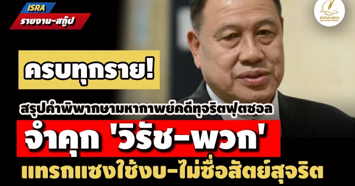 - ตัดสินแล้ว! คดีทุจริตฟุตซอล จำคุก 4 ปี 'วิรัช รัตนเศรษฐ'- เมียโดนด้วย ได้ประกันตัว