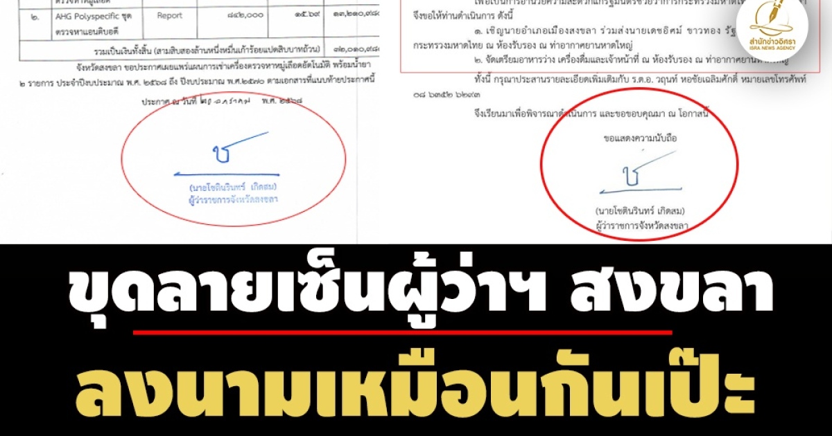พบว่ามีลักษณะเหมือนกับลายเซ็นในหนังสือแจ้งเวียนคำสั่งไปยังนายอำเภอ ทุกอำเภอ ให้มาร่วมต้อนรับ-ส่ง นายเดชอิศม์ ขาวทอง รัฐมนตรีช่วยว่าการกระทรวงมหาดไทย ที่จะเดินทางมาตรวจราชการตามนโยบายสำคัญของรัฐบาล และมีกำหนดเดินทางกลับกรุงเทพเป็นรายสัปดาห์ ที่ห้องรับรอง ณ ท่าอากาศยานหาดใหม่ พร้อมจัดเตรียมอาหารว่างเครื่องดื่มและเจ้าหน้าที่ที่ห้องรับรอง ท่าอากาศยานหาดใหญ่ ที่ปรากฏเป็นข่าวอยู่ในขณะนี้