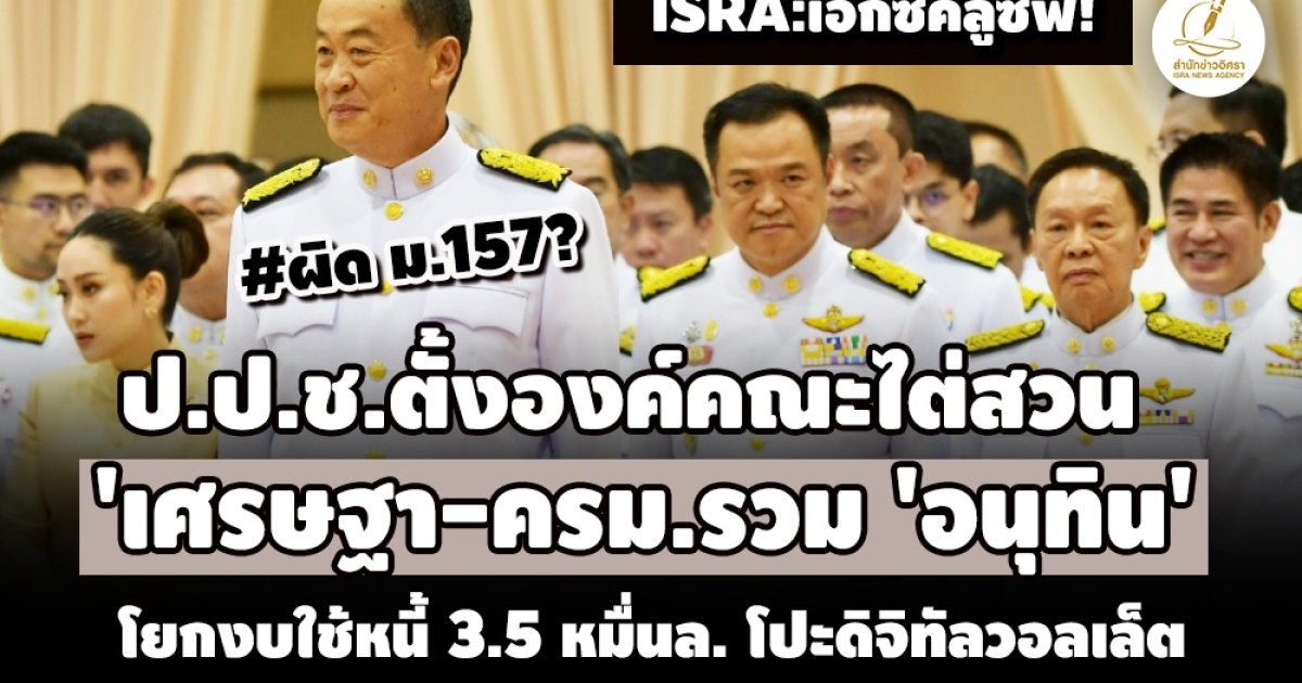 ISRA:เอ็กซ์คลูซีฟ! ป.ป.ช. ลงมติตั้งองค์คณะไต่สวน เศรษฐา ทวีสิน อดีตนายกรัฐมนตรี - ครม. รวมชื่อ อนุทิน ชาญวีรกูล สมัยนั่งรองนายกฯ มท.1 พิจารณาอนุมัติโยกงบ'ใช้หนี้'3.5 หมื่นล.โปะ'ดิจิทัลวอลเล็ต' ไม่เข้าข่ายการกระทำความผิดตามรัฐธรรมนูญ มาตรา 144 แต่เป็นความผิด ป.อ. มาตรา 157 นำเงินกู้ไปใช้ผิดประเภท - แพทองธาร กมธ. , สส. , สว. รอด