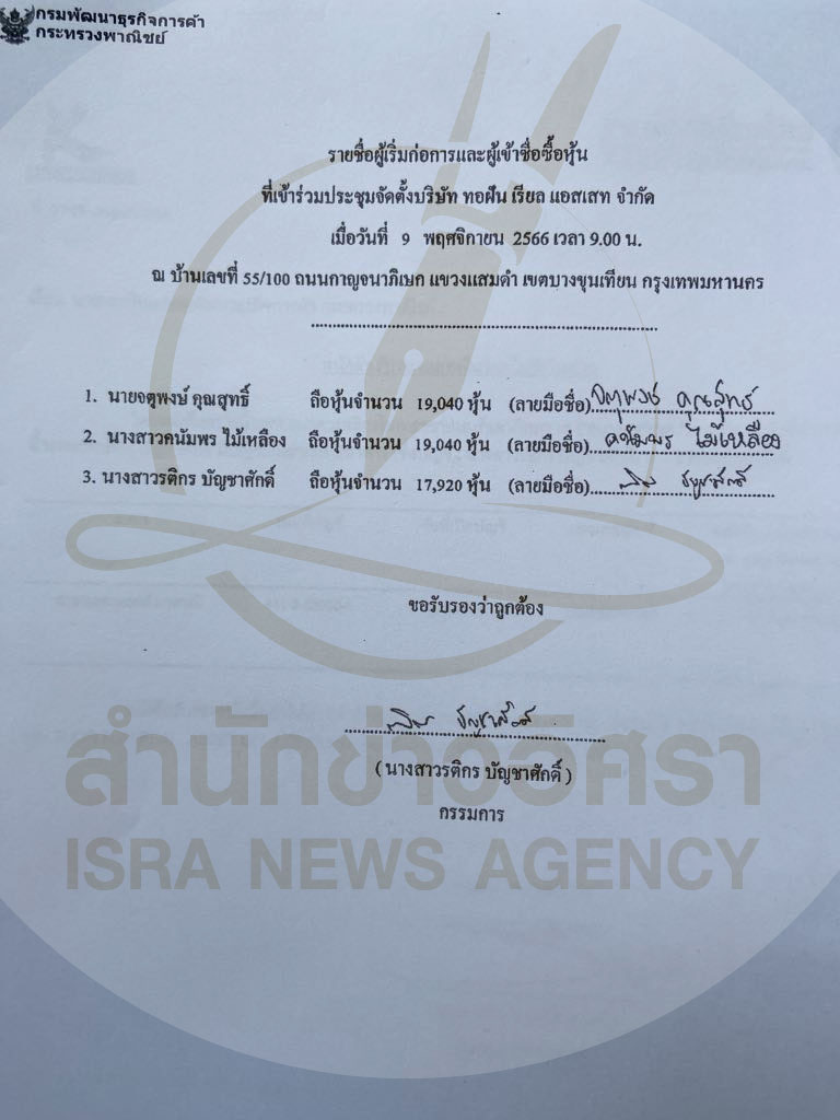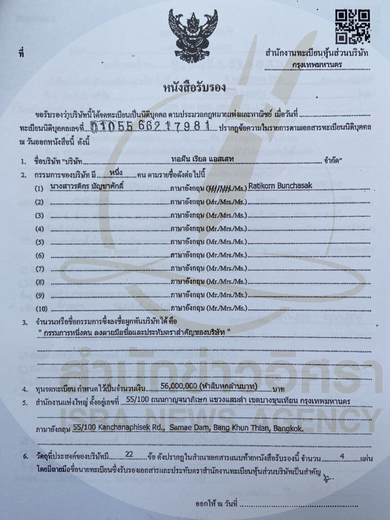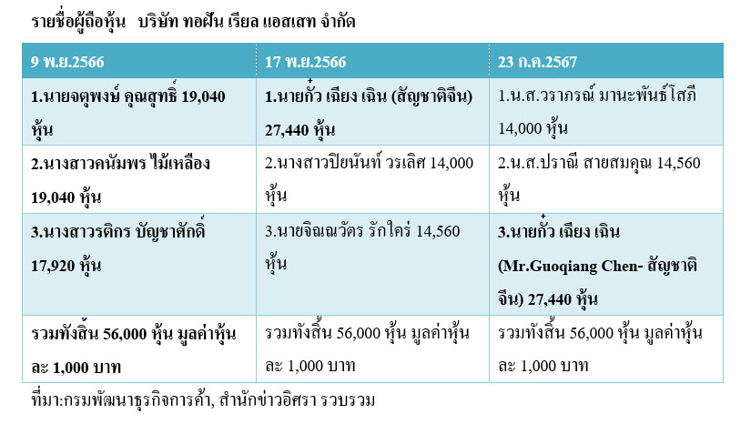 1.บริษัท ทอฝัน เรียล แอสเสท จำกัด จดทะเบียนวันที่ 14 พฤศจิกายน 2566 ทุน 56 ล้านบาท ประกอบกิจการซื้อ ขาย ให้เช่า ทางด้านอสังหาริมทรัพย์ทุกชนิด ที่ตั้งเลขที่ 55/100 ถนนกาญจนาภิเษก แขวงแสมดำ เขตบางขุนเทียน กรุงเทพฯ น.ส.รติกร บัญชาศักดิ์ อายุ 23 ปี เป็นกรรมการผู้ขอจดทะเบียน เป็นกรรมการ และถือหุ้น 17,920 หุ้น นายจตุพงษ์ คุณสุทธิ์ และ นางสาวคนัมพร ไม้เหลือง คนละ 19,040 หุ้น รวมทั้งหมด 56,000 หุ้น มูลค่าหุ้นละ 100 บาท