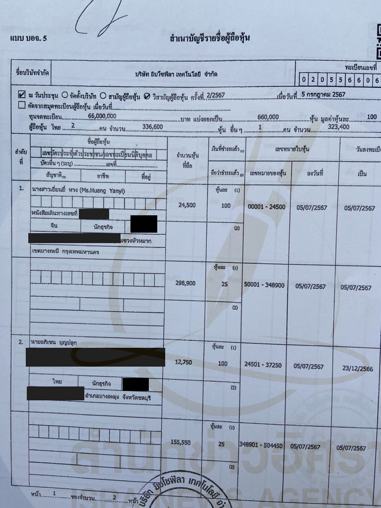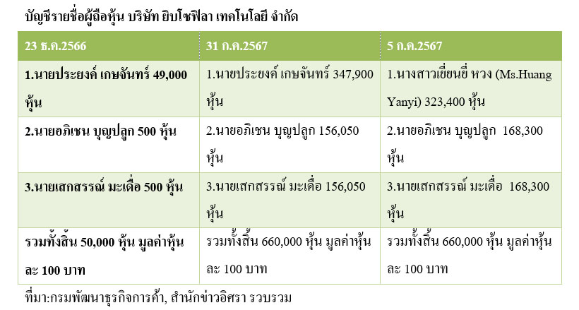 วันที่ 9 ก.ค.2567 นำส่งบัญชีรายชื่อผู้ถือหุ้น (บอจ.5) ต่อนายทะเบียนหุ้นส่วนบริษัทจังหวัดชลบุรี นางสาวเยี่ยนยี่ หวง (Ms.Huang Yanyi) ถือหุ้นใหญ่ 323,400 หุ้น (รับโอนมาจากนายประยงค์ เกษจันทร์) ที่เหลือ นายอภิเชน บุญปลูก 168,300 หุ้น และนายเสกสรรณ์ มะเดื่อ 168,300 หุ้น รวมทั้งสิ้น 660,000 หุ้น มูลค่าหุ้นละ 100 บาท ไม่มีการเปลี่ยนแปลงจนถึงปัจจุบัน(ดูตารางและเอกสาร)