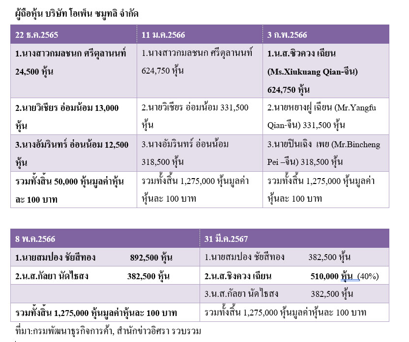 ข้อมูลผู้ถือหุ้น บัญชีรายชื่อผู้ถือหุ้น (บอจ.5) วิสามัญผู้ถือหุ้น ครั้ง 1/2566 เมื่อวันที่ 17 ธ.ค.2566 นายกั๋วเฉียง เฉิน ถือหุ้นใหญ่ 27,440 หุ้น (49%) ผู้ถือหุ้นอื่นอีกคน 2 คน (ดูตารางและเอกสาร)