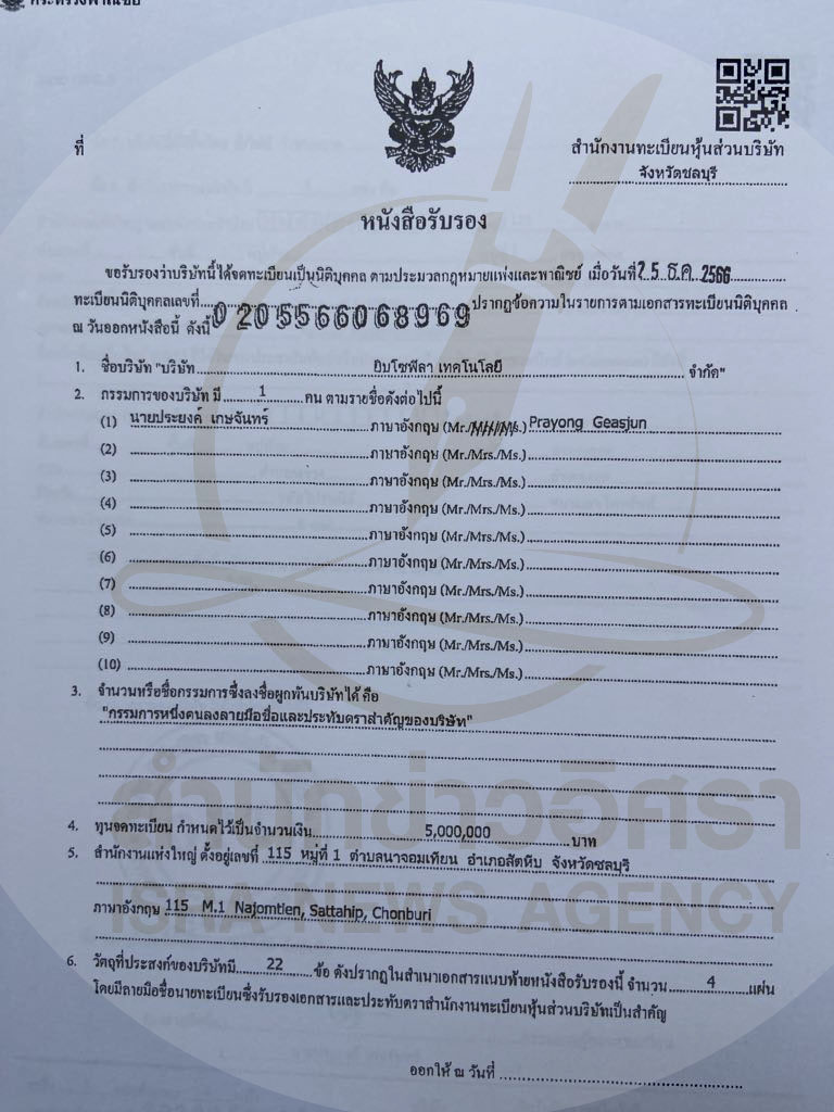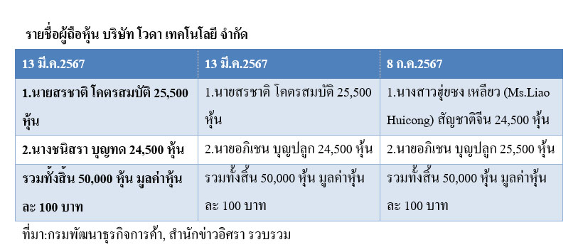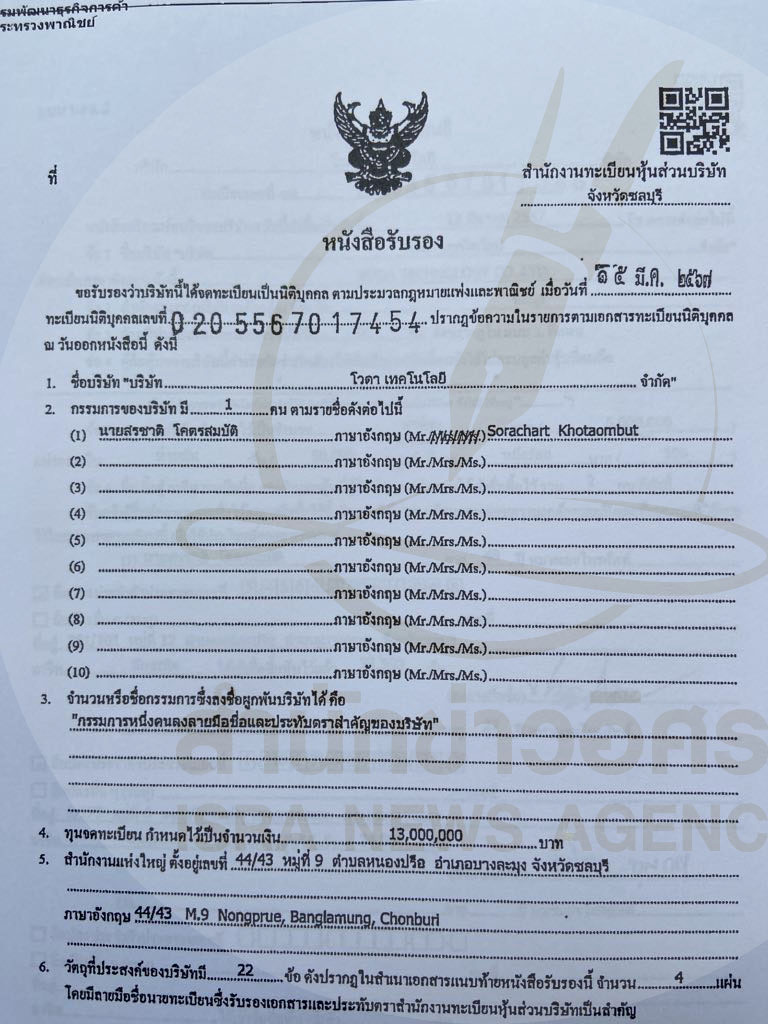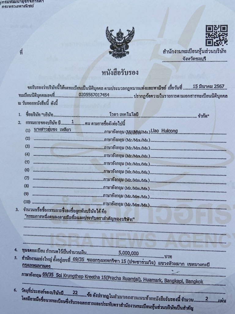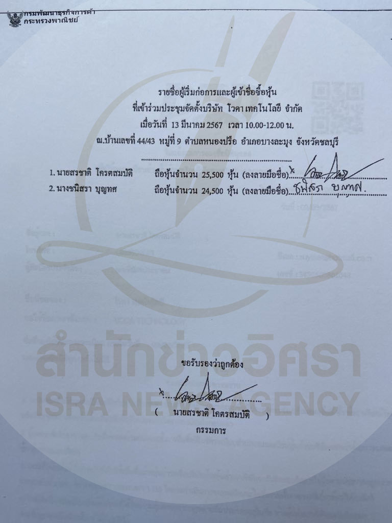 4.บริษัท โวดา เทคโนโลยี จำกัด จดทะเบียนวันที่ 15 มีนาคม 2567 ทุน 5 ล้านบาท ประกอบกิจการซื้อ ขาย ให้เช่า ทางด้านอสังหาริมทรัพย์ทุกชนิด ที่ตั้งเลขที่ 44/43 หมู่ที่ 9 ต.หนองปรือ อ.บางละมุง จ.ชลบุรี นายสรชาติ โคตรสมบัติ ถือหุ้นใหญ่และเป็นกรรมการ/ผู้จดทะเบียนก่อตั้ง หลังจากนั้นจดทะเบียนเปลี่ยนแปลงกรรมการและที่ตั้งสำนักงาน