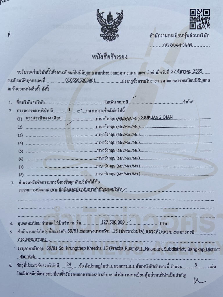3 ก.พ.2566 จดทะเบียนเปลี่ยนแปลงกรรมการ น.ส.ซิวควง เฉียน (Ms.Xiukuang Qian) อายุ 38 ปี สัญชาติจีน เข้าเป็นกรรมการ และแจ้งสำนักงานที่ตั้งเลขที่ 69/81 หมู่บ้านนาราสิริ ซอยกรุงเทพกรีฑา 15 (ประชาร่วมใจ) แขวงหัวหมาก เขตบางกะปิ กรุงเทพมหานคร