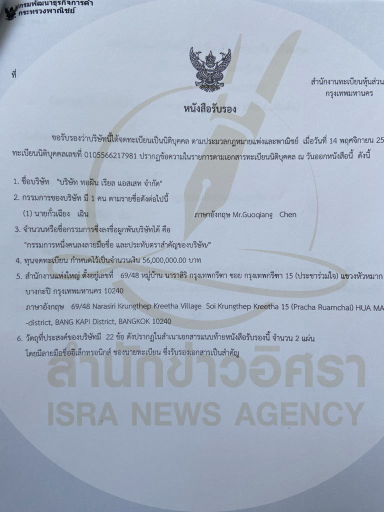 @จดทะเบียนก่อตั้ง -หุ้นใหญ่ คนไทย อยู่เมืองชล ก่อนโอนให้คนจีน