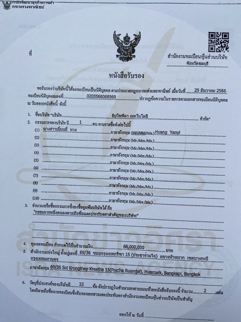 18 ธ.ค.2566 จดทะเบียนเปลี่ยนแปลงกรรมการ นายกั๋วเฉียง เฉิน อายุ 32 ปี สัญชาติจีนเข้าเป็นกรรมการ (น.ส.รติกร บัญชาศักดิ์ ออก) แจ้งสำนักงานี่ตั้งเลขที่ 69/48 หมู่บ้านนาราสิริ กรุงเทพกรีฑา ซอยกรุงเทพกรีฑา 15 (ประชาร่วมใจ) แขวงหัวหมาก เขตบางกะปิ กรุงเทพมหานคร