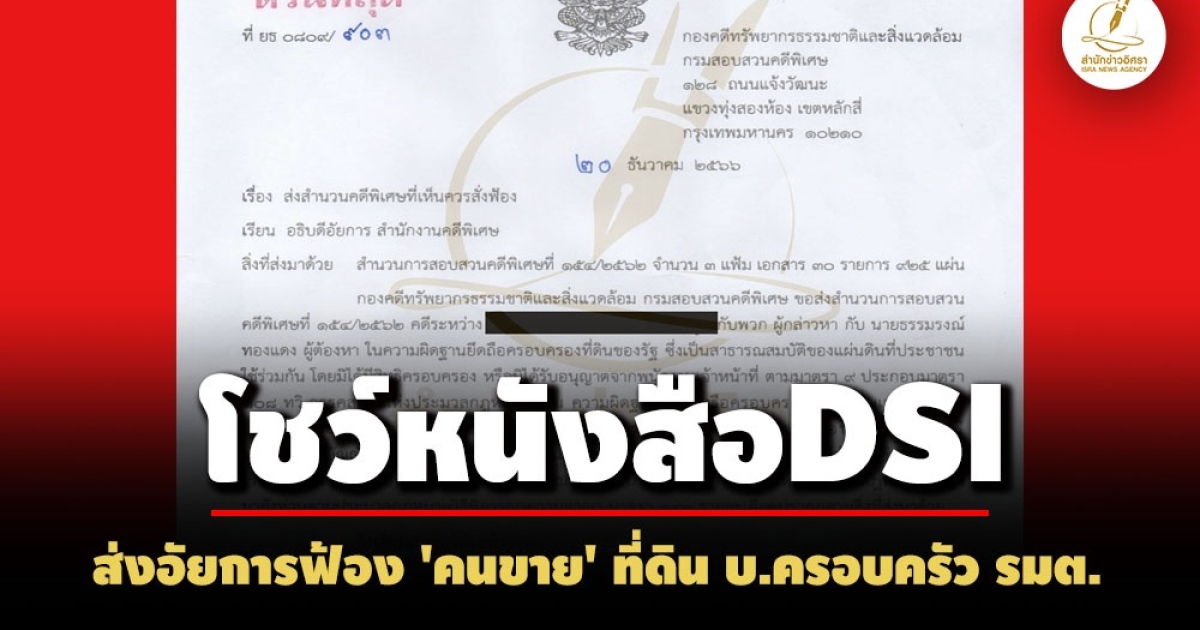 โชว์หนังสือ ดีเอสไอ ส่งสำนวนอัยการฟ้องคดีขุดบ่อรุกที่สาธารณะอุบลฯ ในส่วน 'คนขาย' ก่อนหลบหนีถูกหมายจับ แจ้งข้อกล่าวหาหนักความผิดฐานยึดถือครอบครองที่ดินของรัฐสาธารณสมบัติแผ่นดินประชาชนใช้ร่วมกัน ส่วนบริษัทครอบครัว 'สุดาวรรณ หวังศุภกิจโกศล' รมว.อว ผู้ซื้อ แยกเป็นอีกคดี ปัจจุบันอยู่ระหว่างสอบสวนข้อมูล ยังไม่ได้มีแจ้งข้อกล่าวหา