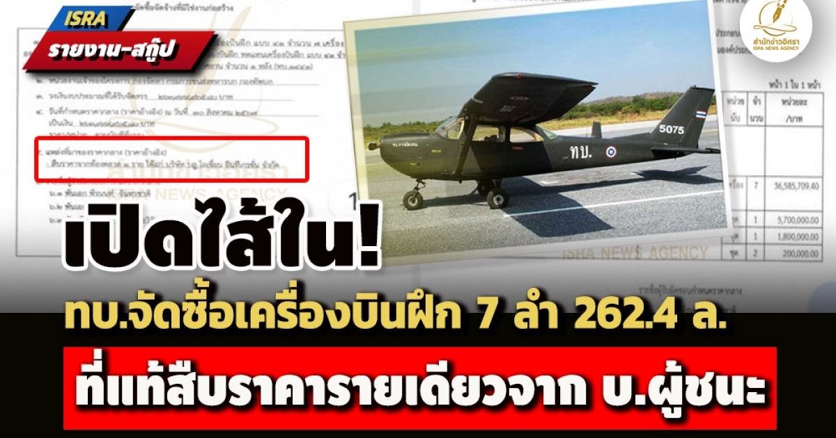 เปิดข้อมูลไส้ใน กองทัพบกจัดซื้อเครื่องบินฝึก 7 ลำพร้อมโรงจอด 262.4 ล. โดยวิธีเฉพาะเจาะจง ที่มาราคากลาง สืบจากเอกชนรายเดียว บ.บลู โอเชี่ยน อินทีเกรชั่น ผู้ชนะ ตก 36.5 ล./ลำ รายการชิ้นส่วนซ่อม 1,000 ชั่วโมง