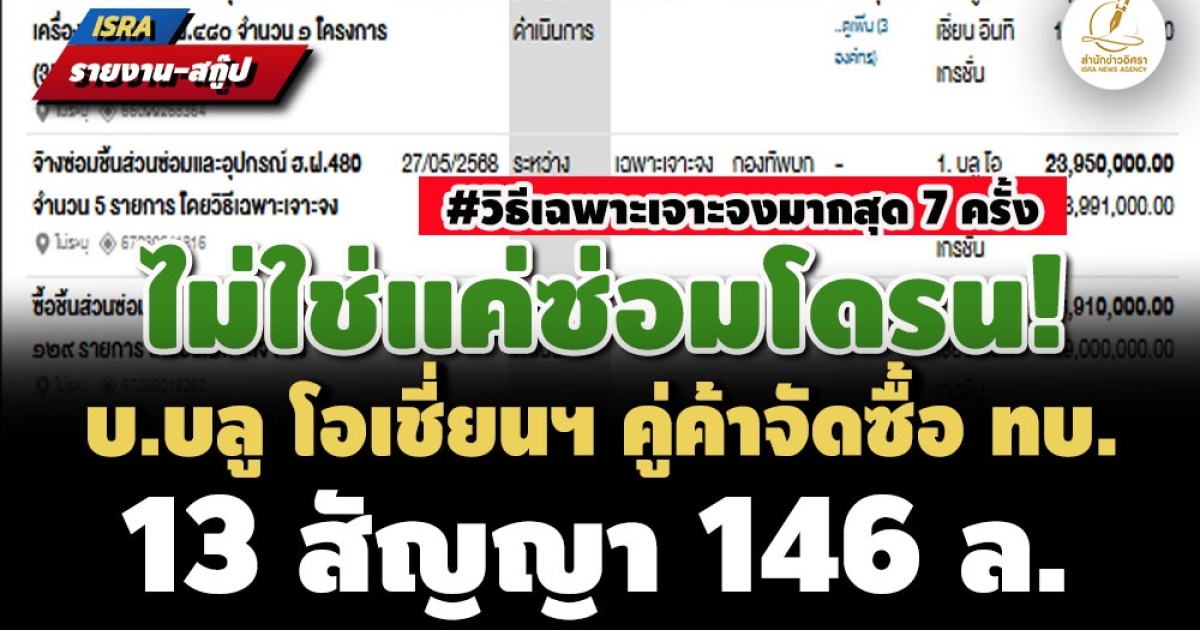 เปิดหมด ไม่ใช่แค่ซ่อมโดรน! ก่อนเป็น‘ผู้ชนะ’จัดหาเครื่องบินฝึก 7 ลำ 262.4 ล. พบ บ.บลู โอเชี่ยน อินทีเกรชั่น คว้าจัดซื้อจัดจ้าง 3หน่วยงาน ทบ. ช่วงปี 2566-2568 รวม 13 สัญญา 146 ล้าน ใช้วิธีเฉพาะเจาะจง มากสุด 7 รายการ คัดเลือก 5 ขส.ทบ. ขณะที่ระบบ e-bidding แค่ 1 รายการ