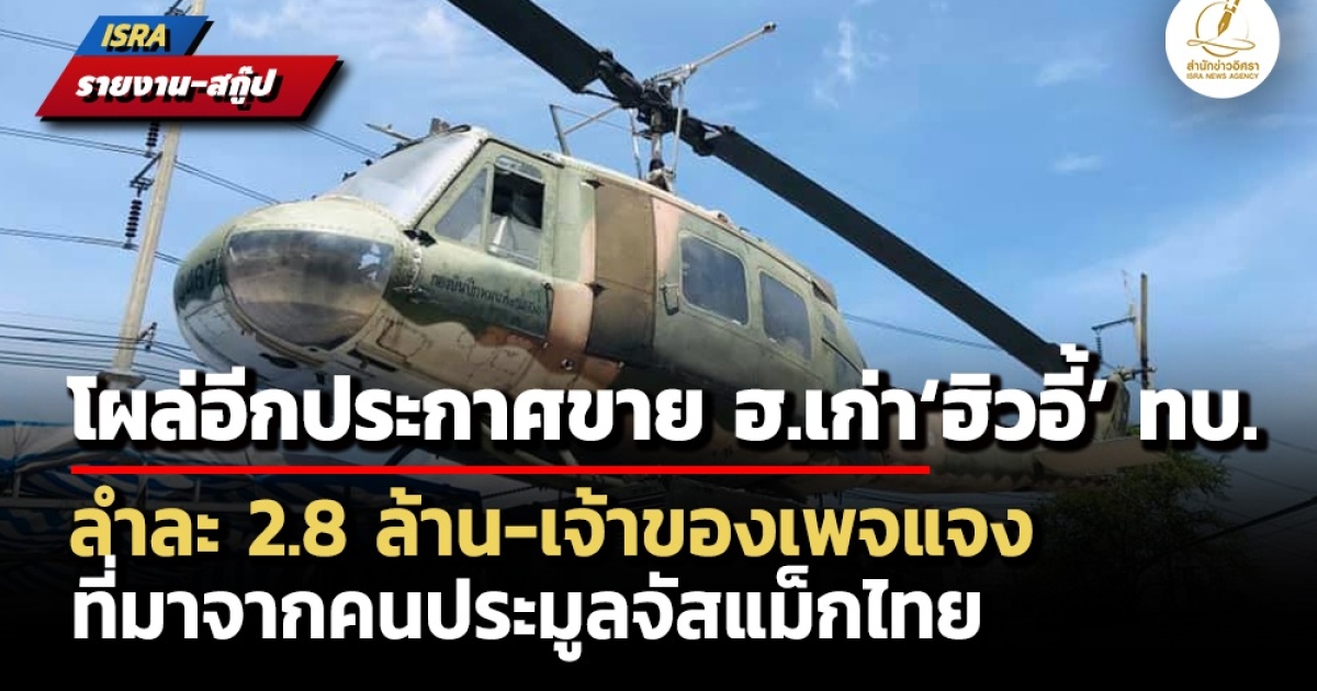 โผล่อีกประกาศขายเฮลิคอปเตอร์เก่า‘ฮิวอี้’กองทัพ คราวนี้ ลำละ 2.8 ล้าน อ้างมี 6 ลำ ติดข้อความหราทบ. ‘กองบินปีกหมุนที่ 1’ อุปกรณ์ครบอดีต ขรก.สงสัยอยู่ในมือพ่อค้าได้อย่างไร ตาม กม. ต้องทำผ่าน ก.กลาโหม เสนอ ครม.อนุมัติปลดระวาง จี้ ‘ภูมิธรรม’ตรวจสอบ ด้านเจ้าของเพจแจงที่มาจากคนประมูลผ่านจัสแม็กก่อนขายต่อเพจที่สระบุรี อ้างได้มาแค่ 3 ลำ