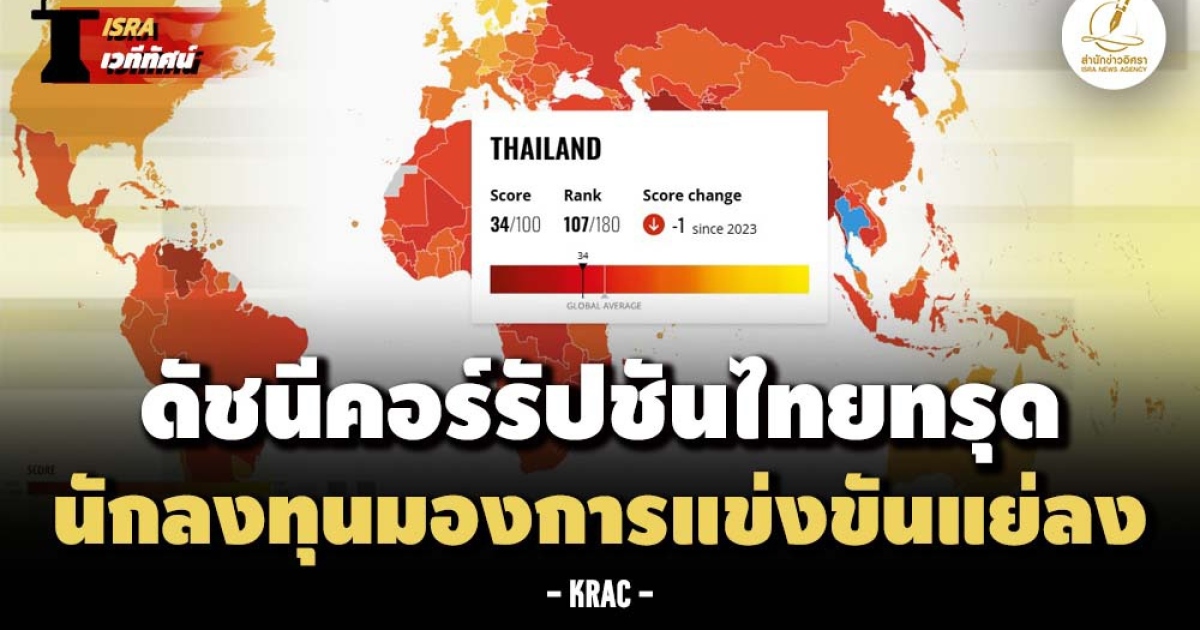 "...ไทยได้ 34/100 คะแนน (อันดับ 107 ของโลก) ต่ำกว่าค่าเฉลี่ยโลกที่ 43 คะแนน คะแนนลดลง 1 จุด แต่กลับอันดับดีขึ้น เพราะสถานการณ์คอร์รัปชันทั่วโลกแย่ลง!..."