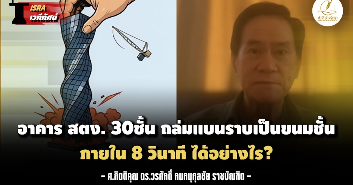 ในคลิปต่อไปนี้ ศ. ดร. วรศักดิ์ กนกนุกุลชัย อธิบายกลไกการถล่มของอาคาร สตง. อย่างละเอียด โดยวิเคราะห์จากคลิปวิดีโอสามมุมที่ซิงค์เวลาตรงกันและแสดงในโหมดสโลว์โมชั่น (10% ของความเร็วปกติ) พร้อมสนับสนุนการวิเคราะห์ด้วยทฤษฎีการรับแรงบิดแบบ St. Venant Torsion และผลการทดลองจากงานวิจัยวิศวกรรมโครงสร้างเกี่ยวกับการวิบัติของคอนกรีตเสริมเหล็กภายใต้แรงบิดกลับไปมา (Cyclic Torsion)