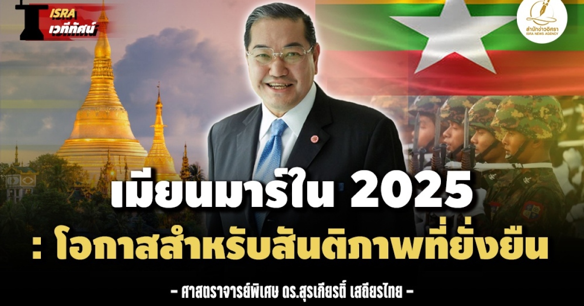 ศาสตราจารย์พิเศษ ดร.สุรเกียรติ์ เสถียรไทย กล่าวถึงแนวทางการสร้างเสริมสันติภาพที่ยั่งยืนในเมียนมาร์ผ่านฉากกระบวนทัศน์อดีต ปัจจุบัน และอนาคต เพื่อสะท้อนถึงรากเหง้าของปัญหาอันเกิดจากความขัดแย้งระหว่างกลุ่มชาติพันธุ์ต่าง ๆ ในเมียนมาร์ ซึ่งเป็นมูลเหตุของความขัดแย้งที่ซับซ้อนที่ฝังรากลึก ทั้งในด้านการเมือง เศรษฐกิจ และสังคม กับนำเสนอหนทางสู่สันติภาพที่ยั่งยืนสำหรับเมียนมาร์ ซึ่งจำเป็นต้องอาศัยการมีส่วนร่วมอย่างสร้างสรรค์ไม่เฉพาะระหว่างคู่ขัดแย้งต่าง ๆ ในเมียนมาร์