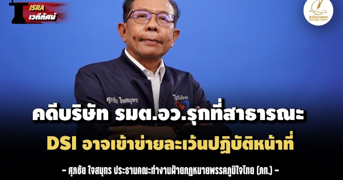 หมายเหตุสำนักข่าวอิศรา (www.isranews.org) :เมื่อวันที่ 10 ส.ค. นายศุภชัย ใจสมุทร ประธานคณะทำงานฝ่ายกฎหมายพรรคภูมิใจไทย (ภท.) ได้โพสต์ข้อความผ่านเฟซบุ๊กส่วนตัวกล่าวถึงกรณีเกิดเสียงวิพากษ์วิจารณ์การทำงานของกรมสอบสวนคดีพิเศษ (ดีเอสไอ) ที่มีความล่าช้าในการสอบสวนคดีบริษัท แป้งมันเอี่ยมอีสานอุตสาหกรรม จำกัด ซึ่งเป็นบริษัทครอบครัว น.ส.สุดาวรรณ หวังศุภกิจโกศล รัฐมนตรีว่าการกระทรวงการอุดมศึกษา วิทยาศาสตร์ วิจัยและนวัตกรรม (อว.) ในรัฐบาล น.ส.แพทองธาร ชินวัตร ขุดบ่อน้ำบุกรุกที่สาธารณประโยชน์ จนคดีใกล้จะหมดอายุความ ขณะที่ น.ส.สุดาวรรณ ไม่ขอตอบในประเด็นนี้เพราะกลัวจะกระทบกับบริษัท