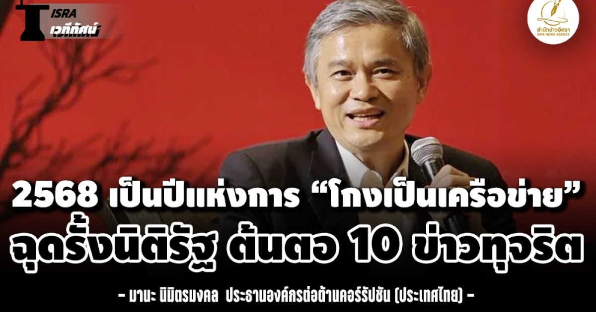 นายมานะ นิมิตรมงคล ประธานองค์กรฯ ได้สื่อสารกับประชาชนผ่านช่องทาง https://www.facebook.com/share/p/1CtzWYJ1fi/ ว่า ปี 2568 เป็นปีแห่งการ “โกงเป็นเครือข่าย” มีหลายเหตุการณ์ที่นักการเมืองและชนชั้นนำได้กระทำเรื่องผิดความคาดหวังของสังคมอย่างไม่เกรงกลัวใคร ไม่สนใจจริยธรรม ขณะที่ ส.ว. และกรรมการองค์กรอิสระฯ จำนวนมากกลายเป็นภาระของบ้านเมือง จนการต่อต้านคอร์รัปชันเป็นเรื่องยาก ฉุดรั้งนิติรัฐและสิทธิมนุษยชนอย่างรุนแรง ดังกรณี 10 ข่าวคอร์รัปชัน ต่อไปนี้