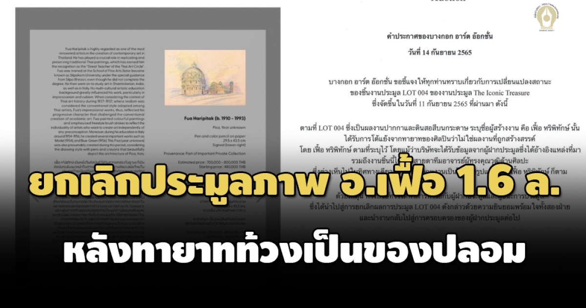 'บ.บางกอก อาร์ต อ๊อกชั่น' ยกเลิกประมูลขายงานศิลป์ 1.6 ล้าน หลังทายาท 'อ.เฟื้อ หริพิทักษ์' อดีตศิลปินแห่งชาติ ชี้เป็นภาพปลอม ไม่ใช่ผลงานของพ่อ ด้านเอกชนแจง ที่ผ่านมา มีผู้คุณวุฒิตรวจสอบแล้ว ยืนยันเป็นภาพ อ.เฟื้อจริง