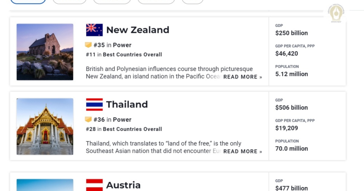 สำนักข่าวอิศรา (www.isranews.org) รายงานข่าวว่าเมื่อช่วงต้นปี 2566 สำนักข่าว US News และWorld Report ได้มีการจัดอันดับประเทศที่ทรงอำนาจมากที่สุดในโลกประจำปี 2565 โดยประเทศไทยถูกจัดให้อยู่ในอันดับที่ 36 จากอันดับทั้งหมด 85 ประเทศ โดยอยู่ระหว่างนิวซีแลนด์ที่ได้อันดับ 35 และประเทศออสเตรียที่ได้อันดับ 37
