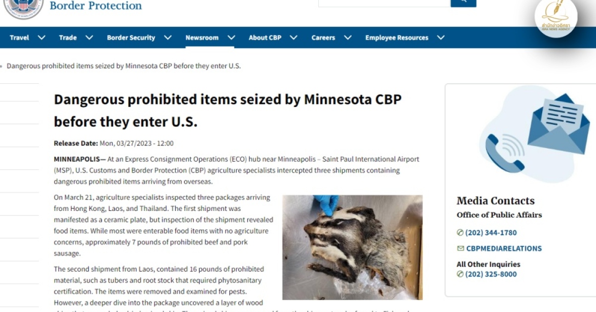 สำนักข่าวอิศรา (www.isranews.org) รายงานข่าวกรณีเกี่ยวกับการสกัดจับสินค้าผิดกฎหมายที่มีต้นทางมาจากประเทศไทยว่ามีข่าวว่าที่ศูนย์กลางผู้ประกอบการของเร่งด่วนหรือ Express Consignment Operations (ECO) ซึ่งอยู่ใกล้กับเมืองมินนิอาโปลิส และใกล้กับสนามบินนานาชาติเซนต์พอล ในรัฐมินนิโซตา เจ้าหน้าที่พิเศษของหน่วยงานศุลกากรและการป้องกันชายแดนของสหรัฐอเมริกา (CBP) ได้ดำเนินการสกัดและตรวจยึดสินค้าอันตรายและต้องห้ามที่ถูกขนส่งมาจากต่างแดน