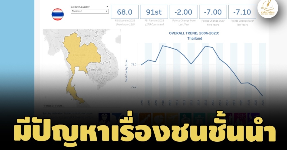 ไทยติดอันดับ 91 ประเทศเสี่ยงรัฐล้มเหลว แม้อันดับดีขึ้นกว่าปีก่อน แต่พบมีปัญหามากที่สุดในด้านกลุ่มชนชั้นนำ ติดอันดับ 8 ของโลก ขณะเมียนมาเสี่ยงรัฐล้มเหลวอันดับที่ 12 ของโลก สถานการณ์เลวร้ายสุดในอาเซียน