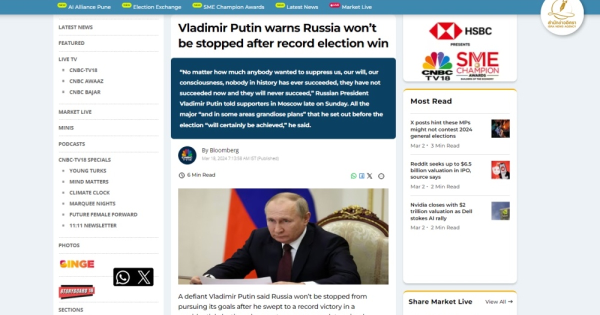 ปธน.ปูตินแถลงรัสเซียจะไม่หยุดยั้งจากเป้าหมาย หลังชนะเลือกตั้งด้วยคะแนนเสียง 87.8 เปอร์เซ็นต์ ย้ำชัดไม่เคยมีใครสำเร็จในการกำจัดรัสเซีย