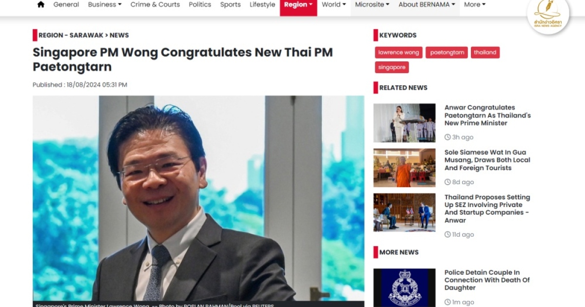สำนักข่าวอิศรา (www.isranews.org) รายงานข่าวเกี่ยวกับการที่รัฐบาลจากต่างประเทศได้แสดงความยินดีต่อการที่ น.ส.แพทองธาร ชินวัตร ได้รับการโปรดเกล้าฯ ให้ขึ้นเป็นนายกรัฐมนตรีคนที่ 31 ระบุว่านายลอว์เรนซ์ หว่อง นายกรัฐมนตรีสิงคโปร์ได้แสดงความยินดีกับ น.ส.แพทองธาร โดยกล่าวว่า ตัวเขายืนยันว่ามิตรภาพระหว่างสิงคโปร์และไทยจะยังเป็นสิ่งที่จำเป็นในช่วงหลายปีข้างหน้านี้