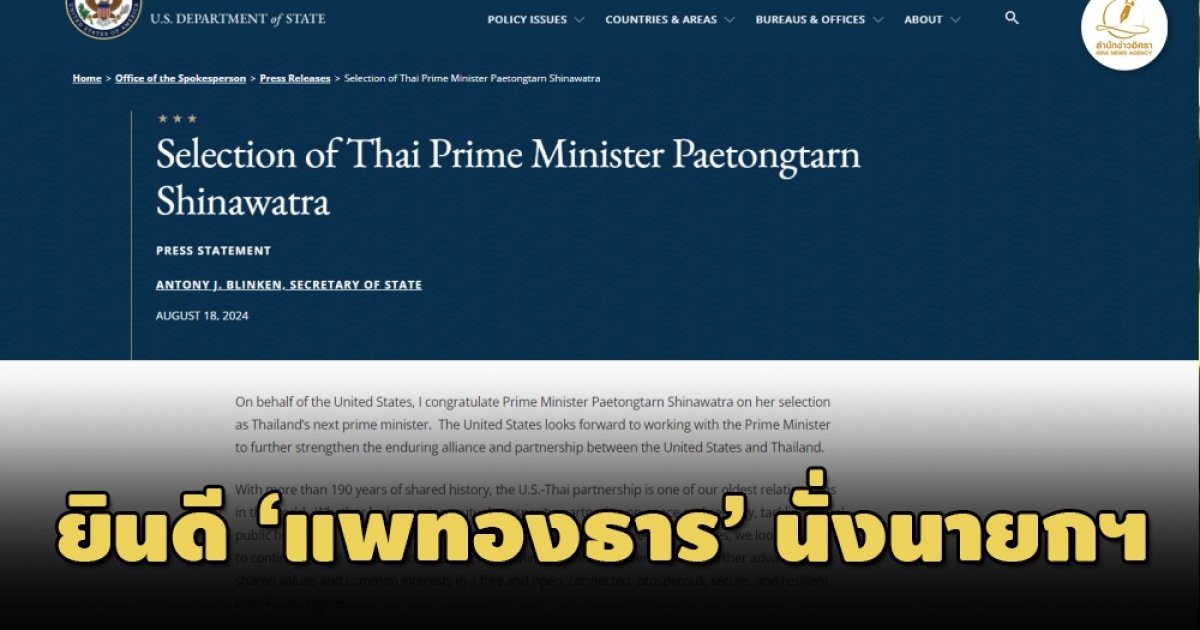 กต.สหรัฐฯ ออกแถลงแสดงความยินดี แพทองธารนั่งนายกฯ คนที่ 31 หวังทำงานร่วมกันกับ รบ.ไทยเสริมสร้างความเป็นหุ้นส่วน ยกประวัติศาสตร์สัมพันธ์ 190 ปี เก่าแก่ที่สุดในโลก