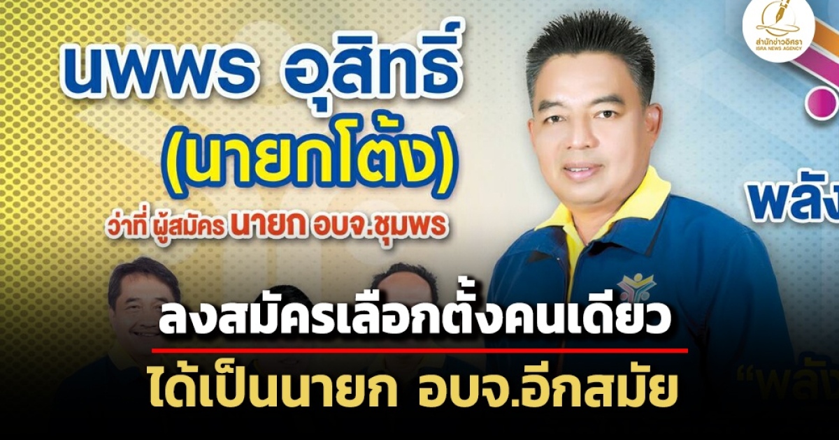 ผลเลือกตั้ง นายก อบจ.ชุมพร 'นพพร อุสิทธิ์' อดีตนายก อบจ.ชุมพร สมัครคนเดียว ไร้คู่แข่ง ได้คะแนนรวม 156,806 คะแนน เกิน ร้อยละ 10 ของผู้ลงคะแนนเสียง ได้เป็นนายก อบจ.อีกสมัย