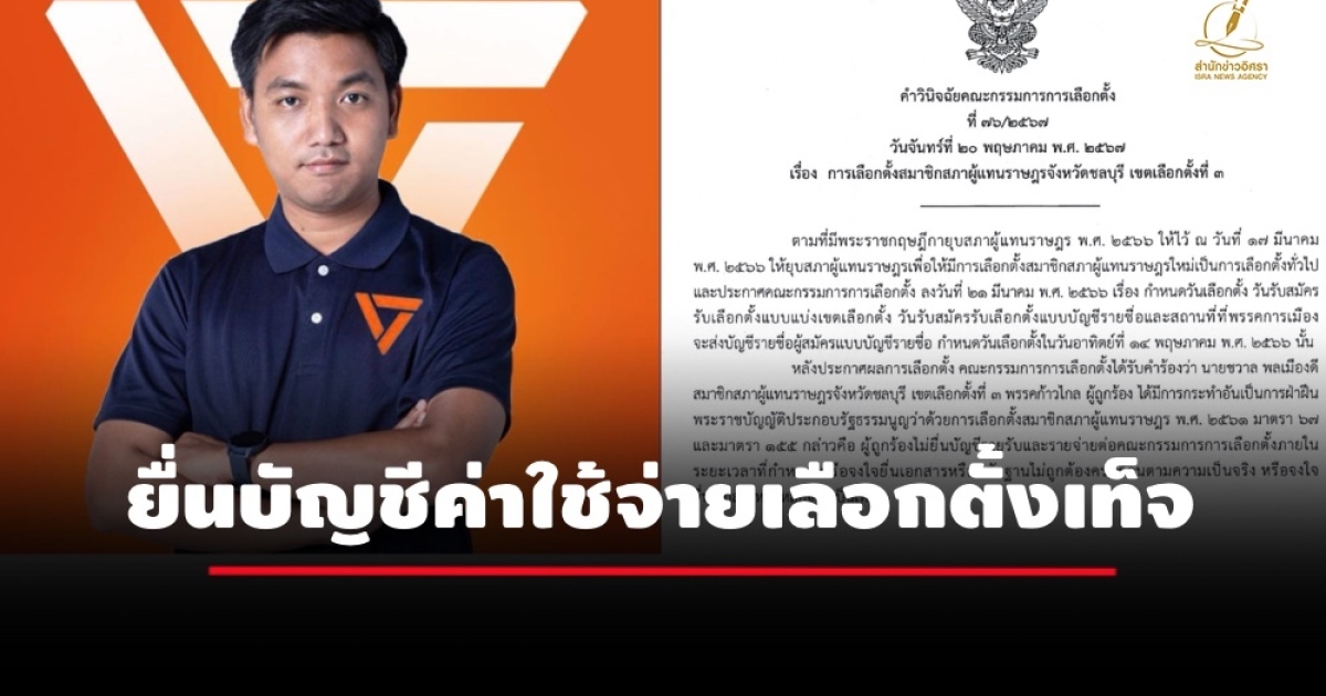 กกต.สั่งดำเนินคดีอาญา 'ชวาล พลเมืองดี' สส.พรรคประชาชน เขต 3 จังหวัดชลบุรี ยื่นบัญชีค่าใช้จ่ายเลือกตั้งเท็จ