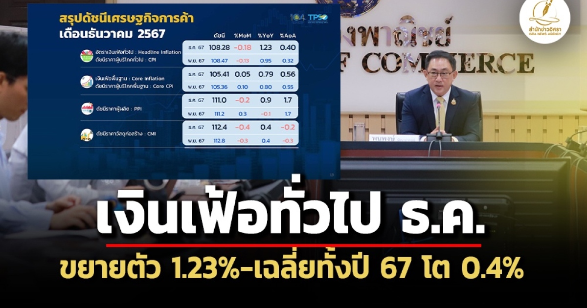 เมื่อวันที่ 6 ม.ค. นายพูนพงษ์ นัยนาภากรณ์ ผู้อำนวยการสำนักงานนโยบายและยุทธศาสตร์การค้า (สนค.) กระทรวงพาณิชย์ แถลงดัชนีเศรษฐกิจการค้า เดือน ธ.ค.2567 ว่า ดัชนีราคาผู้บริโภคทั่วไป หรืออัตราเงินเฟ้อทั่วไป (CPI) ในเดือน ธ.ค.2567 เท่ากับ 108.28 ขยายตัว 1.23% เมื่อเทียบกับช่วงเดียวกันของปีก่อน โดยมีสาเหตุหลักจากการสูงขึ้นของราคาน้ำมันเชื้อเพลิง ซึ่งเป็นผลจากฐานราคาต่ำกว่าปีก่อน
