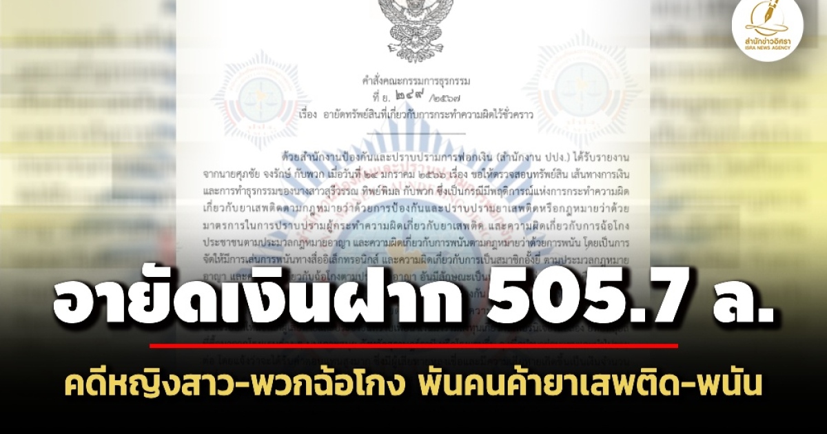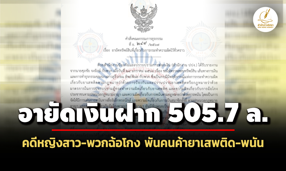 สำนักข่าวอิศรา www.isranews.org รายงานว่า สำนักงานป้องกันและปราบปรามการฟอกเงิน (สำนักงาน ปปง.) มีคำสั่งคณะกรรมการธุรกรรมที่ ย.249 /2567 ลงวันที่ 16 ธันวาคม 2567 เรื่อง อายัดทรัพย์สินที่เกี่ยวกับการกระทำความผิดไว้ชั่วคราว ราย นางสาวสุรีวรรณ ทิพย์วิมล กับพวก เป็นเงินฝาก 125 รายการ รวม 505,740,858.57 บาท ซึ่งเป็นกรณีมีพฤติการณ์แห่งการกระทำความผิดเกี่ยวกับยาเสพติดตามกฎหมายว่าด้วยการป้องกันและปราบปรามยาเสพติดหรือกฎหมายว่าด้วยมาตรการในการปราบปรามผู้กระทำความผิดเกี่ยวกับยาเสพติด และความผิดเกี่ยวกับการฉ้อโกงประชาชนตามประมวลกฎหมายอาญา และความผิดเกี่ยวกับการพนันตามกฎหมายว่าด้วยการพนัน โดยเป็นการจัดให้มีการเล่นการพนันทางสื่ออิเล็กทรอนิกส์ และความผิดเกี่ยวกับการเป็นสมาชิกอั้งยี่ ตามประมวลกฎหมายอาญา และความผิดเกี่ยวกับฉ้อโกงตามประมวลอาญา อันมีลักษณะเป็นปกติธุระ