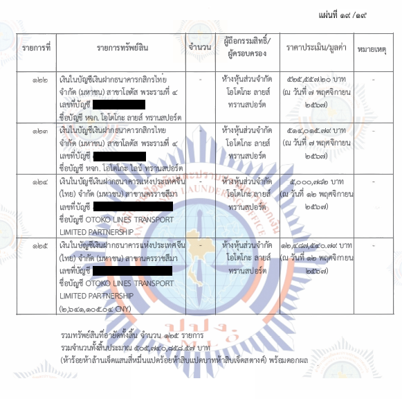 ทรัพย์สินที่ ปปง.อายัด เป็นเงินในบัญชีเงินฝาก ที่อยู่ชือบุคคลที่เป็นชาวไทยและชาวต่างชาติ อาทิ Ms.CIYAN LIN Ms.YIDAN DING และนิติบุคคล อาทิ บริษัท ป๋อเฉิน 2014 จำกัด บริษัท ไลเคอ โฮเทล แมเนจเมนท์ (ประเทศ) จำกัด บริษัท บี เอ อินเตอร์เทรด (ไทยแลนดฺ จำกัด บริษัท อีส ไชน่า เทรดดิ้ง จำกัด หจก. เป็นต้น