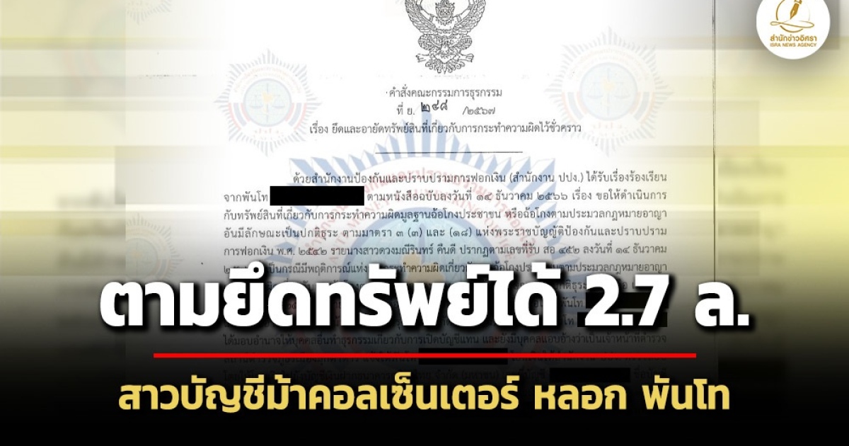 ปปง.สั่งยึดอายัดทรัพย์ ที่ดิน เงินฝาก 18 รายการ 2.7 ล. ‘ดวงมณีรินทร์ ’ พวก บัญชีม้าเครือข่ายคอลเซ็นเตอร์ หลอก พันโท โอนเงิน 10 ครั้ง 3.3 แสน แจ้งความ ตร.ที่ จ.ปทุมฯ พบผู้เสียหาย 22 คน หมดหลายล้าน