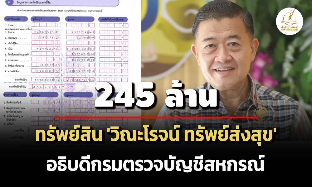 ป.ป.ช. เปิดทรัพย์สิน 'วิณะโรจน์ ทรัพย์ส่งสุข' อธิบดีกรมตรวจบัญชีสหกรณ์ ทรัพย์สิน 245 ล. รายได้ 2.9 ล./ปี