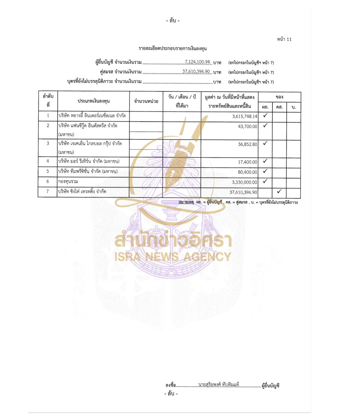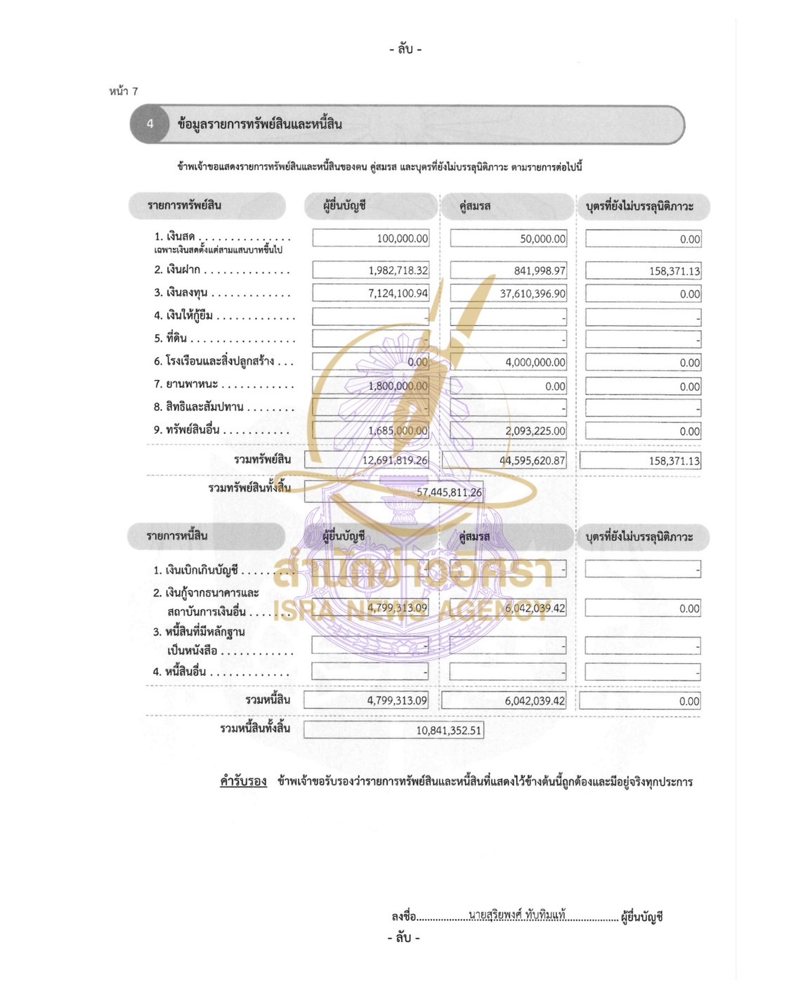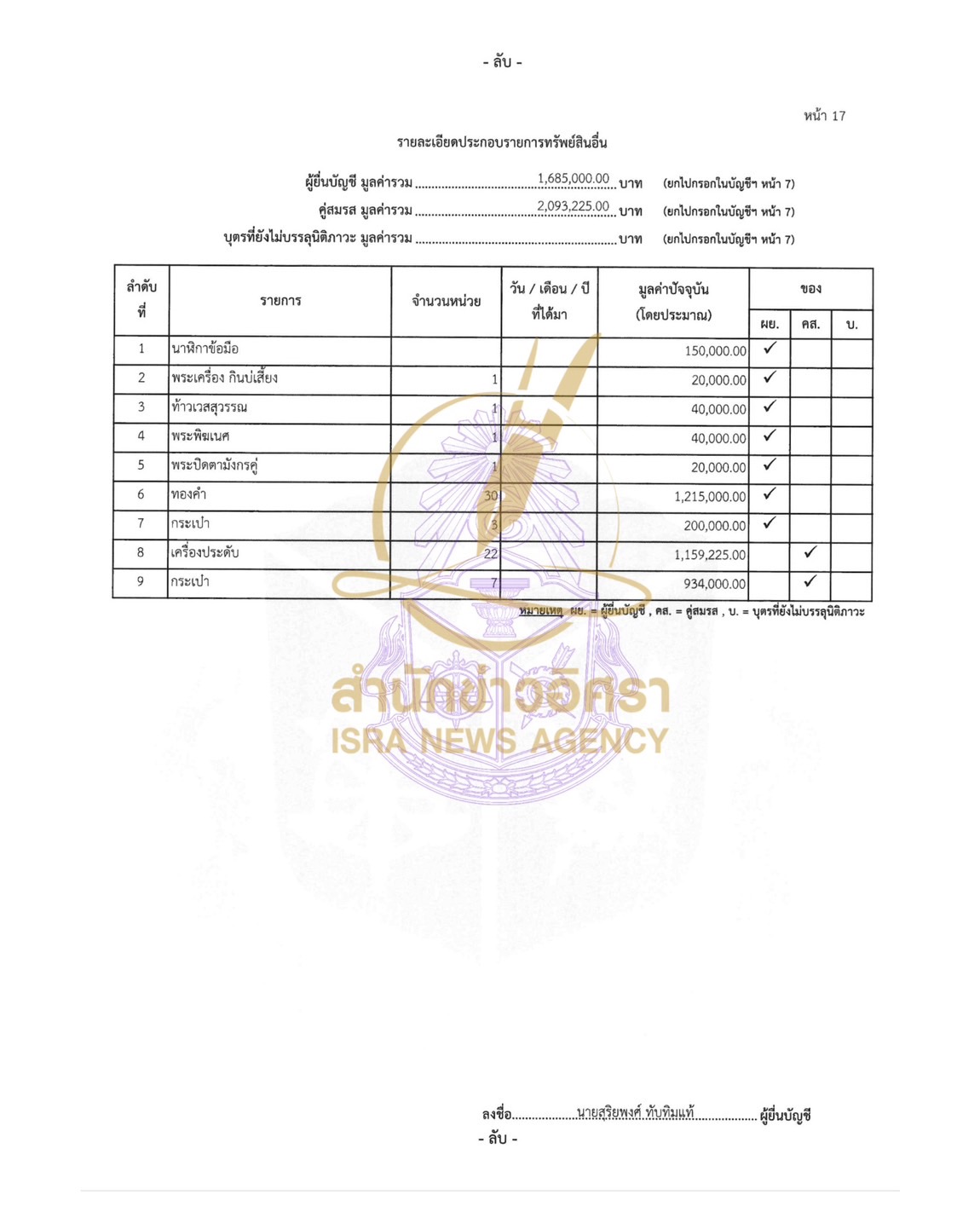 ทั้งนี้นายสุริพงศ์ แจ้งมีรายได้ต่อปีโดยประมาณ 2,700,000 บาท ทั้งหมดเป็นเงินเดือน+ประโยชน์ตอบแทนอื่น แจ้งมีรายจ่ายต่อปีโดยประมาณ 282,000 บาท