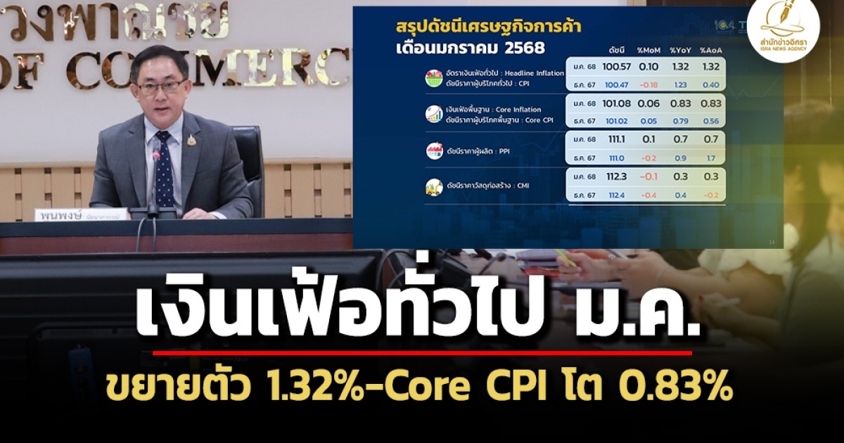 ‘พาณิชย์’ เผยอัตราเงินเฟ้อทั่วไป ม.ค.68 ขยายตัว 1.32% จากราคา ‘น้ำมัน-ผลไม้สด-เครื่องประกอบอาหาร-เครื่องดื่มไม่มีแอลกอฮอล์’ สูงขึ้น ขณะที่ Core CPI โต 0.83%