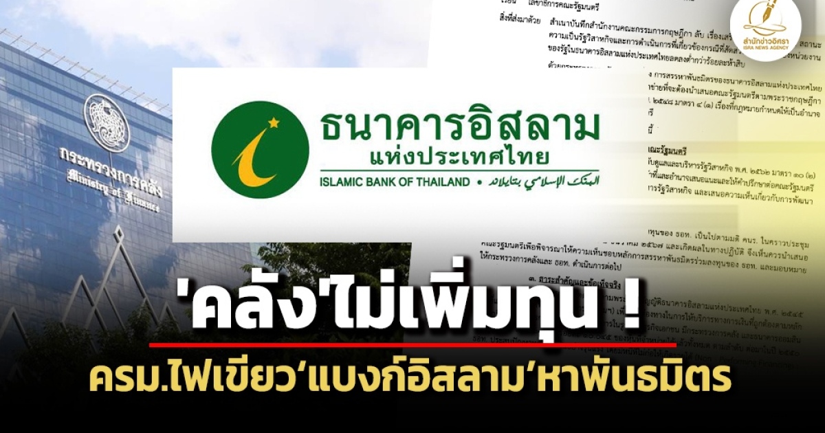 สำนักข่าวอิศรา (www.isranews.org) รายงานว่า ในการประชุมคณะรัฐมนตรี (ครม.) เมื่อวันที่ 4 ก.พ.ที่ผ่านมา ที่ประชุม ครม.มีมติเห็นชอบในหลักการให้ธนาคารอิสลามแห่งประเทศไทย (ธอท.) แสวงหาพันธมิตรร่วมทุนทั้งในและต่างประเทศ เพื่อเข้าร่วมลงทุนในธนาคารอิสลามฯ โดยการแสวงหาพันธมิตรร่วมทุนฯ จะต้องไม่ทำให้สัดส่วนการถือหุ้นของกระทรวงการคลังต่ำกว่า 10% ในช่วง 1 ปี นับจากวันที่การสรรหาพันธมิตรร่วมทุนเสร็จสมบูรณ์