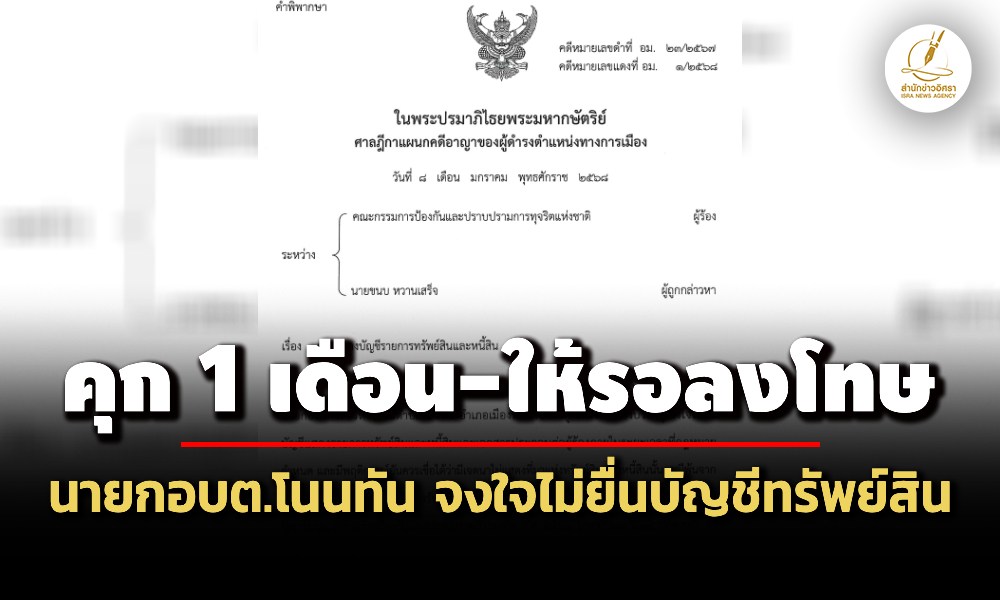 ศาลฎีกาฯจําคุก 1 เดือน ให้รอลงโทษ รองนายก อบต.หนองฉาง จ.อุทัยฯ จงใจไม่ยื่นบัญชีฯ