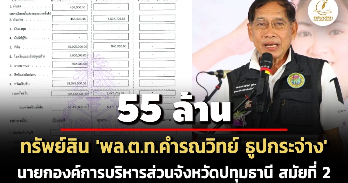 ป.ป.ช.เปิดทรัพย์สินองค์กรปกครองส่วนท้องถิ่น 'พล.ต.ท.คำรณวิทย์ ธูปกระจ่าง' นายก อบจ.ปทุมธานี สมัยที่ 2 ทรัพย์สิน 55 ล. รายได้ 1.6 ล./ปี-เทียบกรณีพ้นตำแหน่งทรัพย์สินลดลง 2 ล.-ภรรยามีทรัพย์สินเพิ่มขึ้น 3 ล.